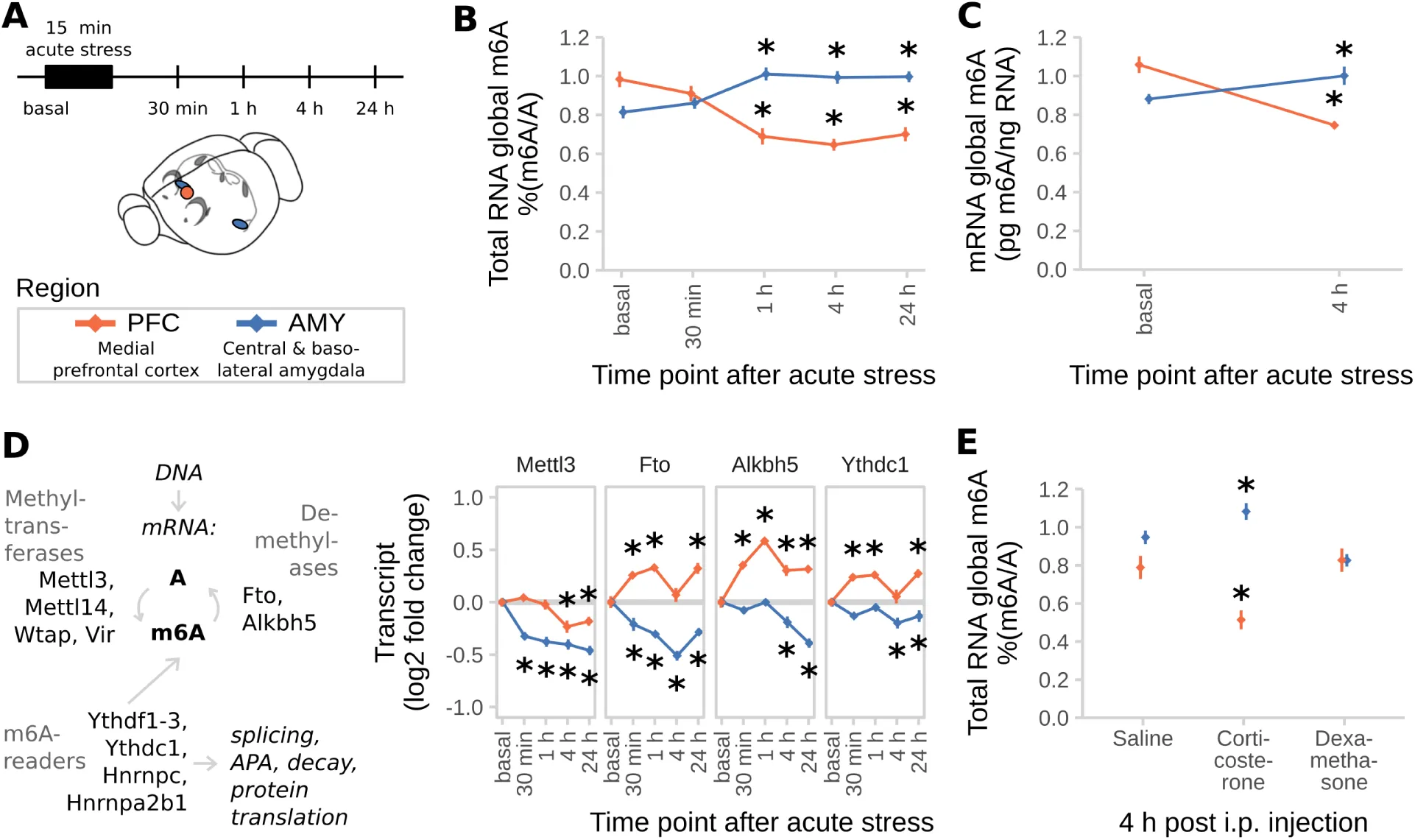In this study, we aimed to elucidate the role of m6A in the context of the brain’s stress response. We delineated the effects of acute stress on m6A using global m6A measurements, m6A-Seq and absolute quantification of transcript-specific methylation levels. In addition, we explored the functional significance of m6A in the adult brain by examining conditional knockout mice for Mettl3 and Fto. Finally, we investigated m6A regulation in blood samples of mice and humans to determine its potential as a peripheral indicator of the central response to stress and stress-linked psychiatric disorders.