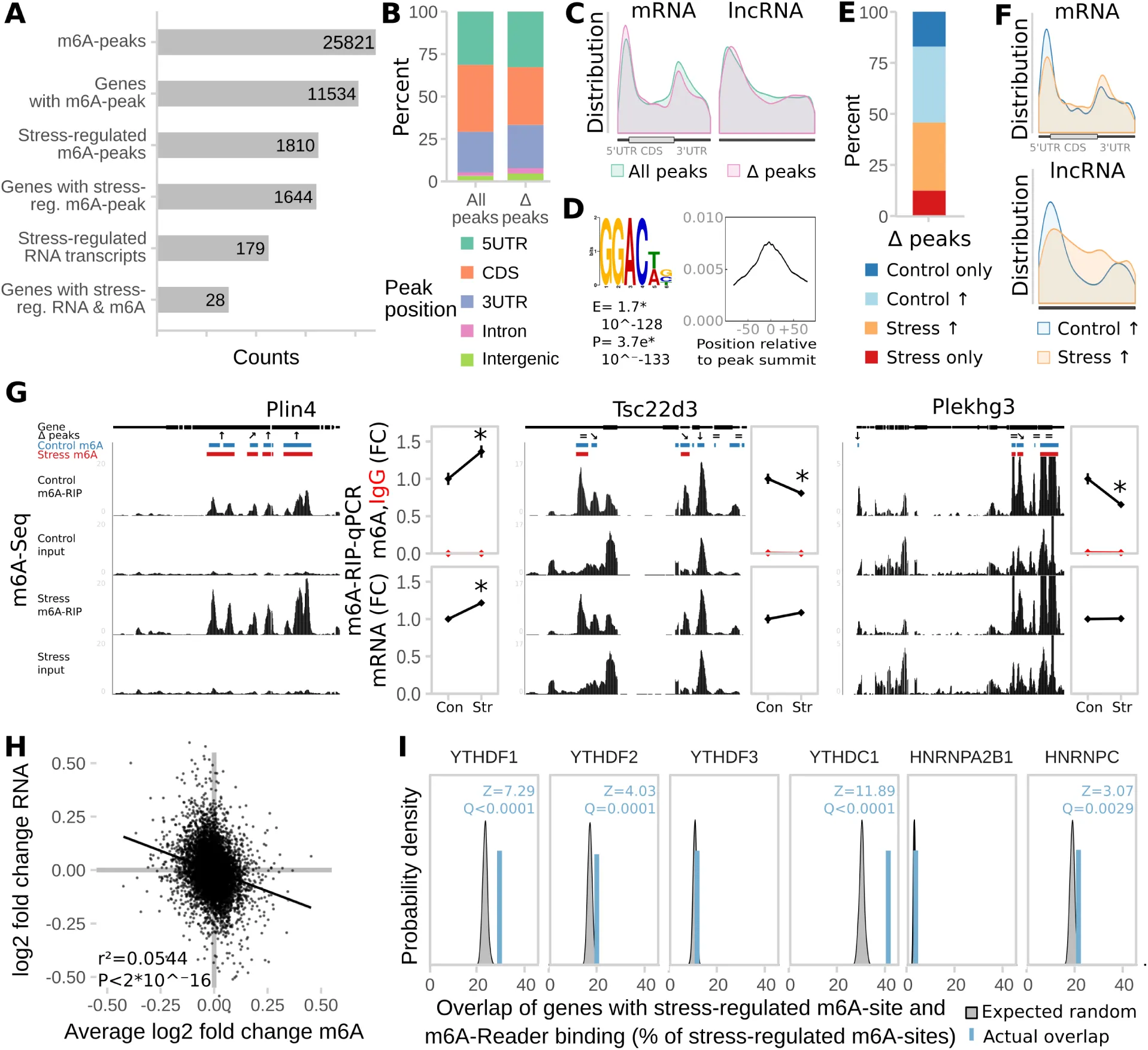 (H) Stress-regulation of m6A negatively correlates with the respective change in mRNA. (log2 fold changes plotted versus RNA fold changes stress to basal, m6A fold change is averaged in case of multiple peaks. n = 25,821, Generalised Linear Model see Table S2.)