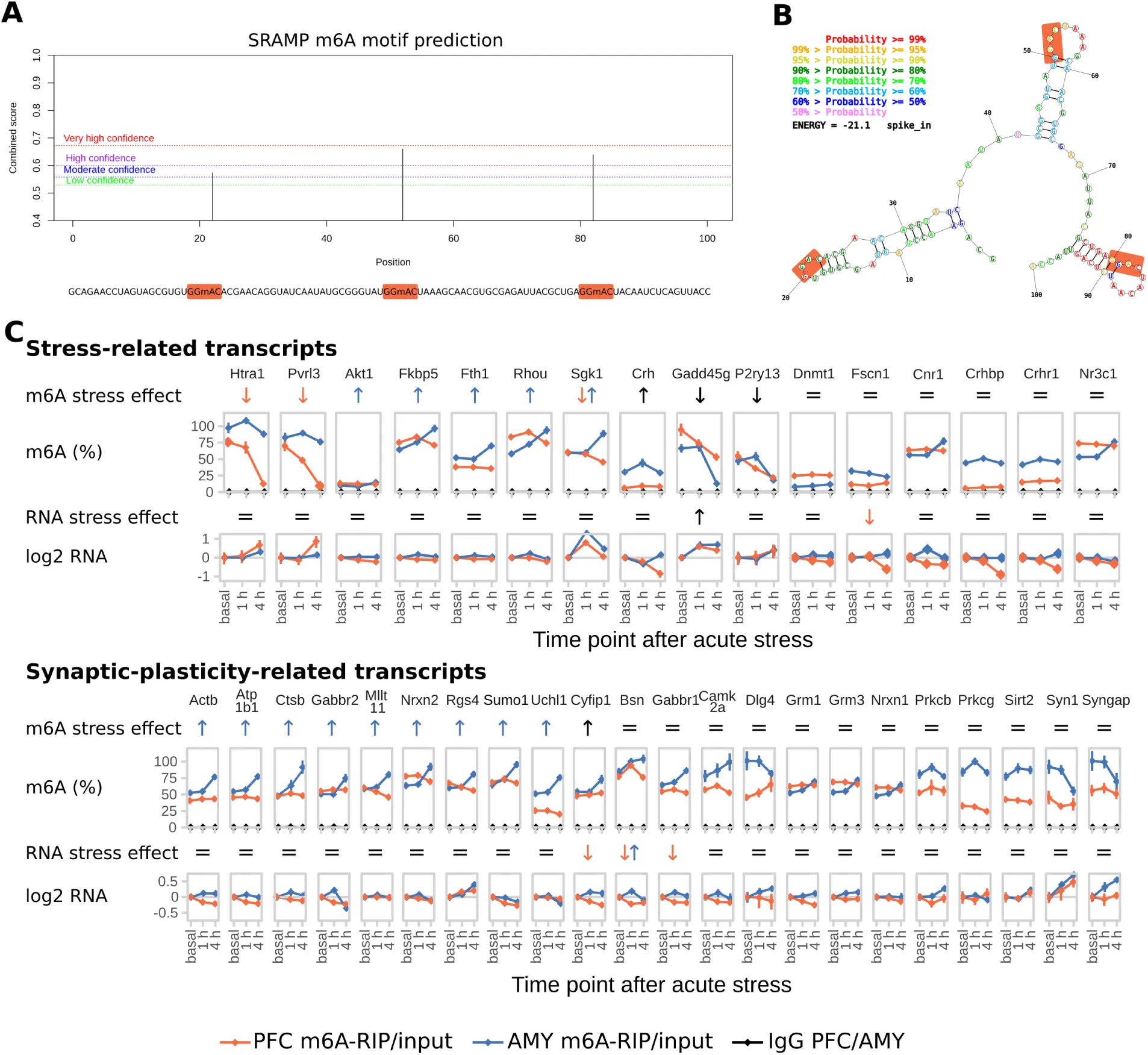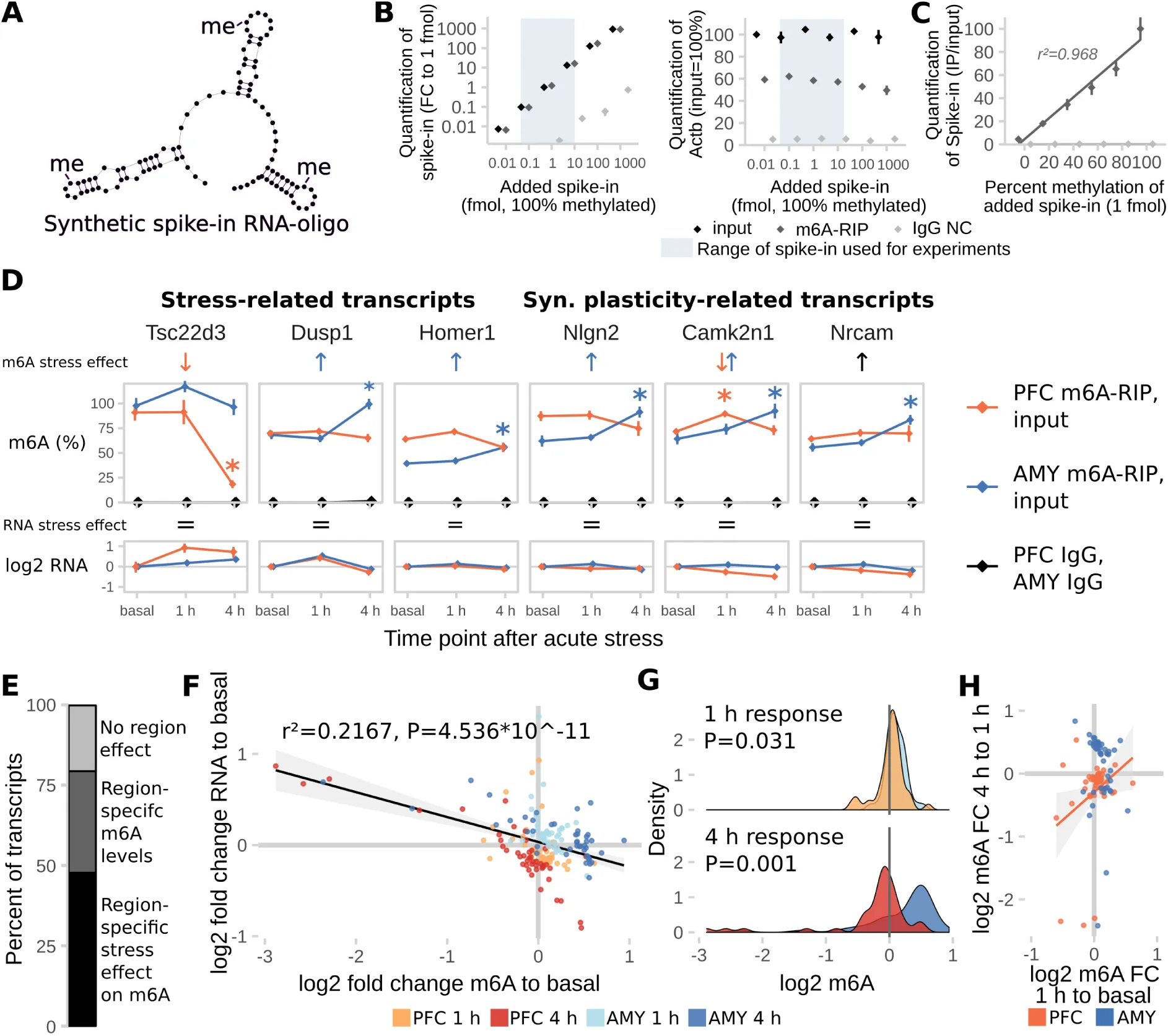 m6A-Seq requires large amounts of input material thus limiting the capacity of the technique to investigate narrowly defined brain regions and also only measures relative enrichment changes and not absolute transcript methylation. Therefore, we performed m6A-immunoprecipitation of full length transcripts (m6A-RIP) followed by qPCR to assess absolute levels of candidate transcript methylation in narrowly defined brain areas, before and after stressful challenge. For calibration of the assay and normalization of immunoprecipitation-efficiency in downstream experiments, we designed and used an m6A-methylated internal spike-in RNA oligonucleotide (Figure 3 A and Figure S3 A, B). The m6A-RIP-qPCR detected m6A methylated RNA spike-in across a wide range of concentrations with low IgG-background signal and without competing with the immunoprecipitation of endogenously methylated RNAs (Figure 3 B). Using mixtures of unmethylated and methylated spike-in oligonucleotides, we confirmed that m6A-RIP-qPCR measured different methylation states of RNAs with high precision (Figure 3 C, r2>0.95).