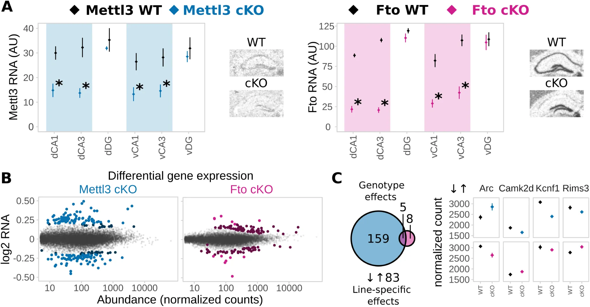 Figure 4:Deletion of Mettl3 or Fto in adult excitatory neurons of the hippocampus CA1 and CA3 alters gene expression in animals.