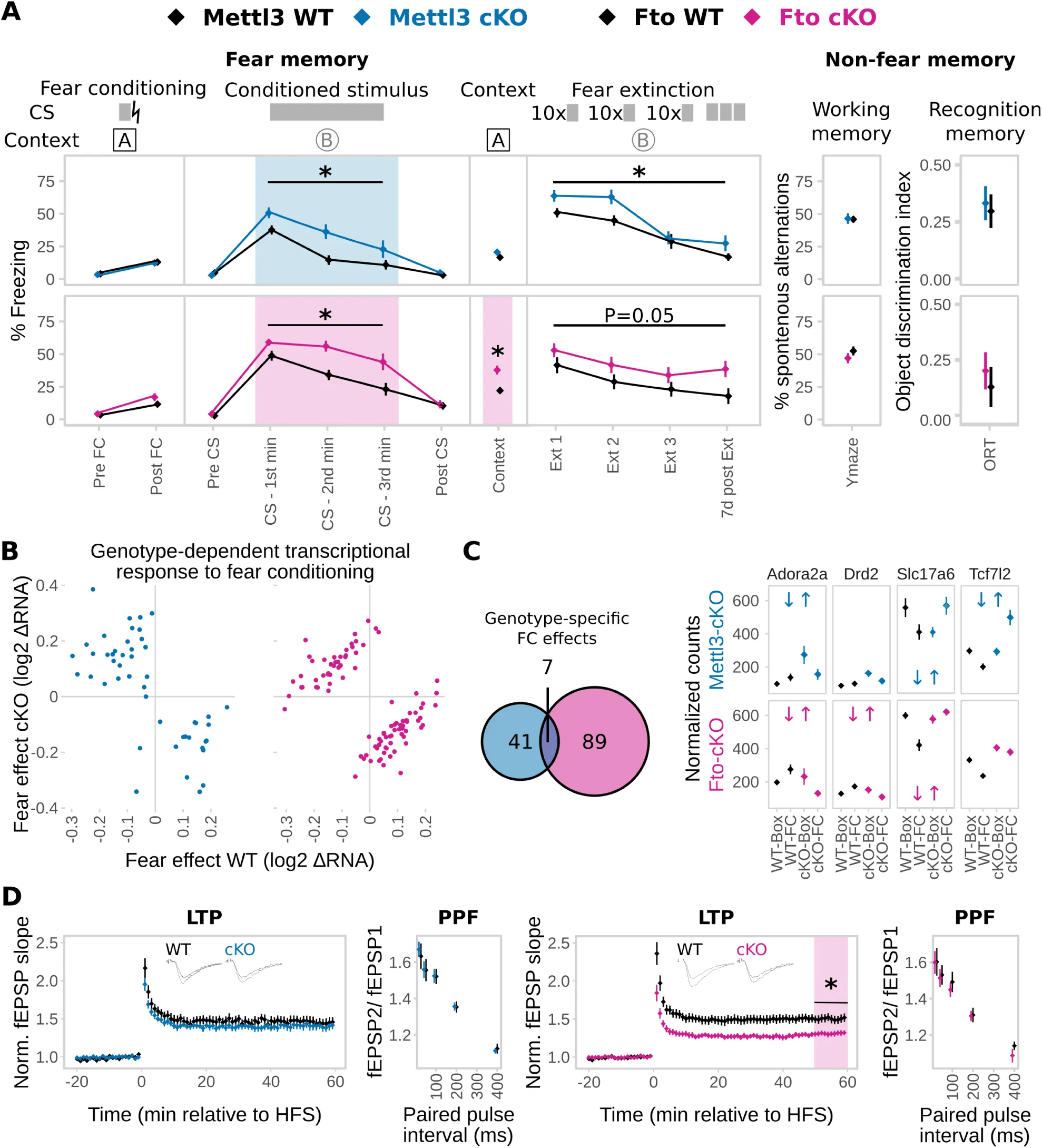 Mettl3 and Fto-KO alter fear memory, transcriptome response and synaptic plasticity