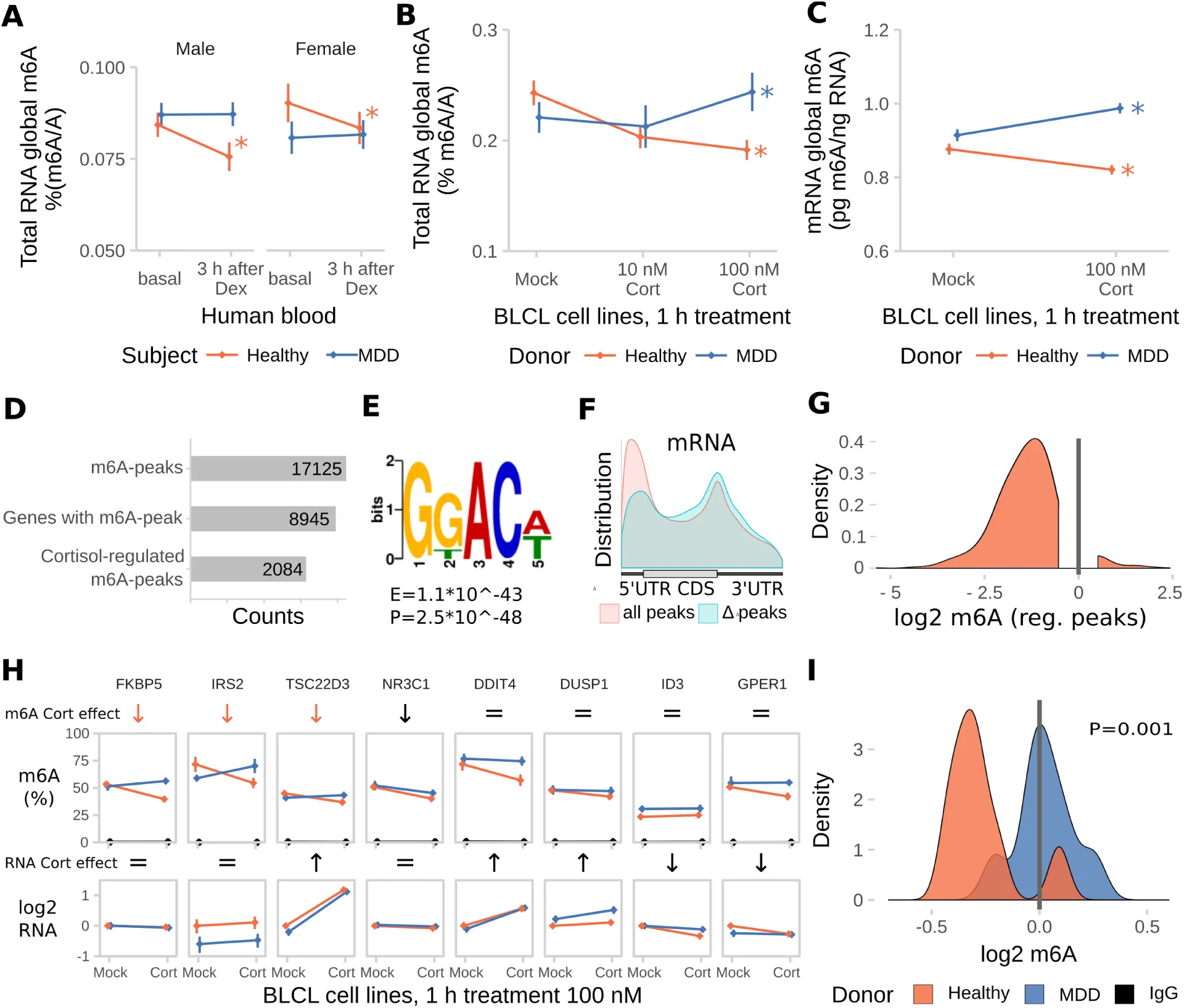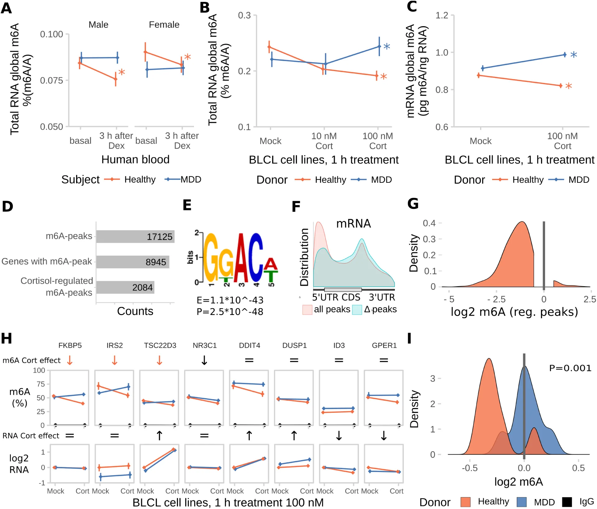 Since dysregulation of the stress response may be an important feature of psychopathologies like Major Depressive Disorder (MDD), we next investigated whether m6A-regulation in response to dexamethasone differs between healthy individuals and MDD patients. In contrast to healthy subjects, down-regulation of m6A in response to dexamethasone was neither observed in male nor female MDD patients (Figure 7 A). To prevent potential contamination of results by antidepressant treatment present in blood of MDD patients, we confirmed the lack of response to GC-stimulation using dexamethasone (Figure S5 A) and cortisol (Figure 7 B total RNA, Figure 7 C mRNA by LC/MS-MS) in B-lymphocyte cell lines (BLCLs) donated by each 6 healthy volunteers and 6 MDD-patients propagated in absence of antidepressants. NR3C1 (GC Receptor) mRNA and protein expression as well as transcriptional response to GC stimulation was unchanged in BLCLs of MDD donors (Figure S6 B-d). To estimate the transcriptome-wide distribution of m6A after GC stimulation, we performed m6A-Seq on BLCLs of one healthy donor treated for 1 h with 100 nM cortisol or mock conditions. We found over 17,000 m6A-peaks in around 9,000 genes in the healthy donor BLCLs (89% of peaks with GGAC motif, 99% of peaks with DRACH motif), with 12 % of those being cortisol-treatment-responsive (Figure 7 D, regulated peaks with absolute log2 fold change > 1, FDR-corrected P-Value < 0.05). Similar to the mouse m6A-Seq, we found the m6A consensus motif was enriched in the m6A-peaks (top motif GKACW) and m6A-peaks were distributed along the transcript-length with preference for both m6A-peaks in the 5’UTR and around the stop codon. Interestingly, in m6A-peaks that were found to be cortisol-responsive, we observed less preference for the 5’UTR with higher contribution of CDS and 3’UTR peaks (Figure 7 E,F). In parallel to the global demethylation observed in BLCLs of healthy donors after cortisol-stimulation, differential m6A-peaks were found to be almost exclusively hypomethylated with higher fold changes than observed in mouse brain (Figure 7g). To precisely quantify regulation of m6A-levels in BLCLs from healthy and MDD-donors, we performed m6A-RIP-qPCR testing for GC-responsive genes in BLCLs after stimulation with cortisol. We observed specific downregulation of m6A in FKBP5, IRS2 and TSC22D3 in cells from healthy but not from MDD individuals (Figure 7h). In line with the general trends observed before, methylation of tested candidates in cells derived from healthy, but not MDD donors, was significantly decreased (Figure 7i).