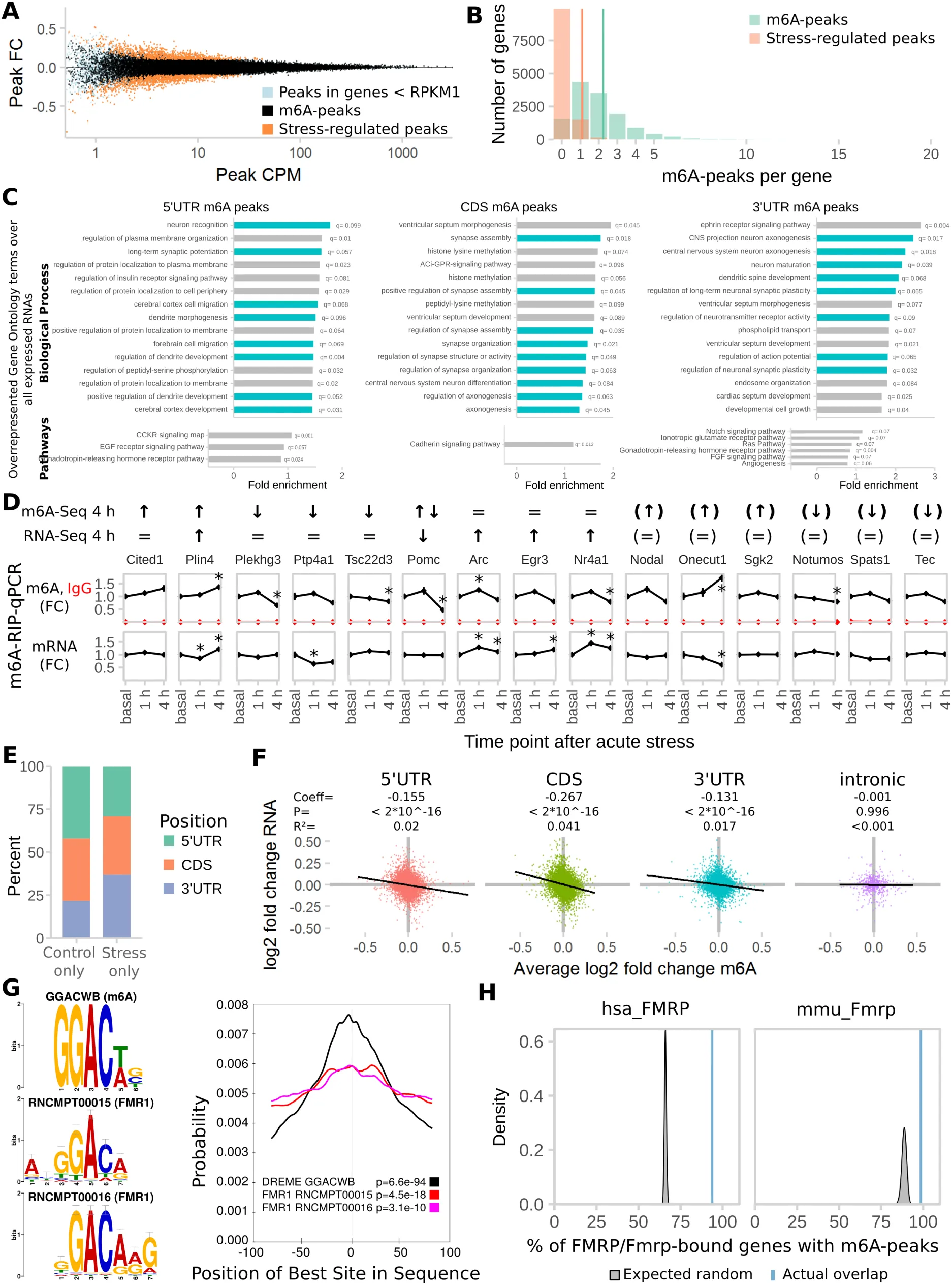 (A) The mouse cortical transcriptome is largely methylated and large parts of the methyltranscriptome are regulated by stress. m6A-Seq of mouse cortex under basal conditions and 4 h after acute restraint stress (n = 7 each from mRNA of 3 mice pooled).