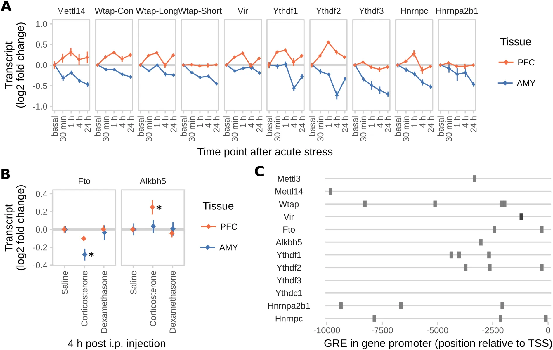 (B) Gene expression regulation of m6A-demethylases Fto and Alkbh5 in the PFC and AMY shows similar patterns of regulation after corticosterone injection like after acute stress. (Fold change measured with qPCR; n = 12, mean ± SEM. Kruskal-Wallis-Test PFC Alkbh5 and AMY Fto P<0.05, Stars: omnibus post-hoc comparisons to basal, P<0.065).