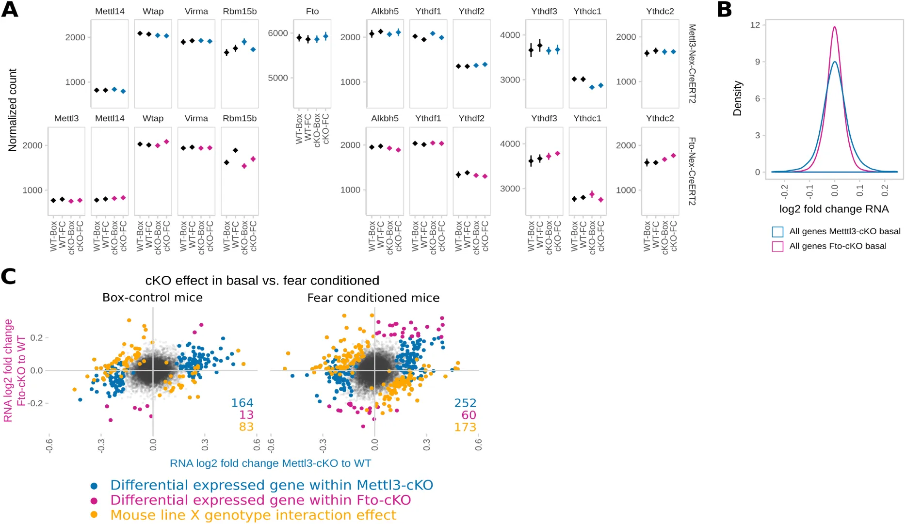 (A) Depletion of Mettl3 or Fto in adult excitatory neurons is not compensated by changes of expression in other genes catalysing and or binding m6A nor is the expression of those genes changed 24 h after fear conditioning. (DeSeq2 Normalized counts of genes plotted across both Mettl3-cKOs and Fto-cKOs and respective wild type animals (WT) including animals 24h after fear conditioning (FC) and control animals (Box). n=5. Significant genotype contrasts with T-Test p<0.05 before but not after multiple testing correction: Rbm15 B in Box-Mettl3-cKOs, Rbm15 B in FC-Fto-cKOs, Ythdc1 in Box MEttl3-cKOs, Ythdc2 in FC-Fto-cKOs, significant fear conditioning contrast T-Test p<0.05 before but not after multiple testing correction: Rbm15 B in WT Fto-cKO and cKO-Mettl3 animals).