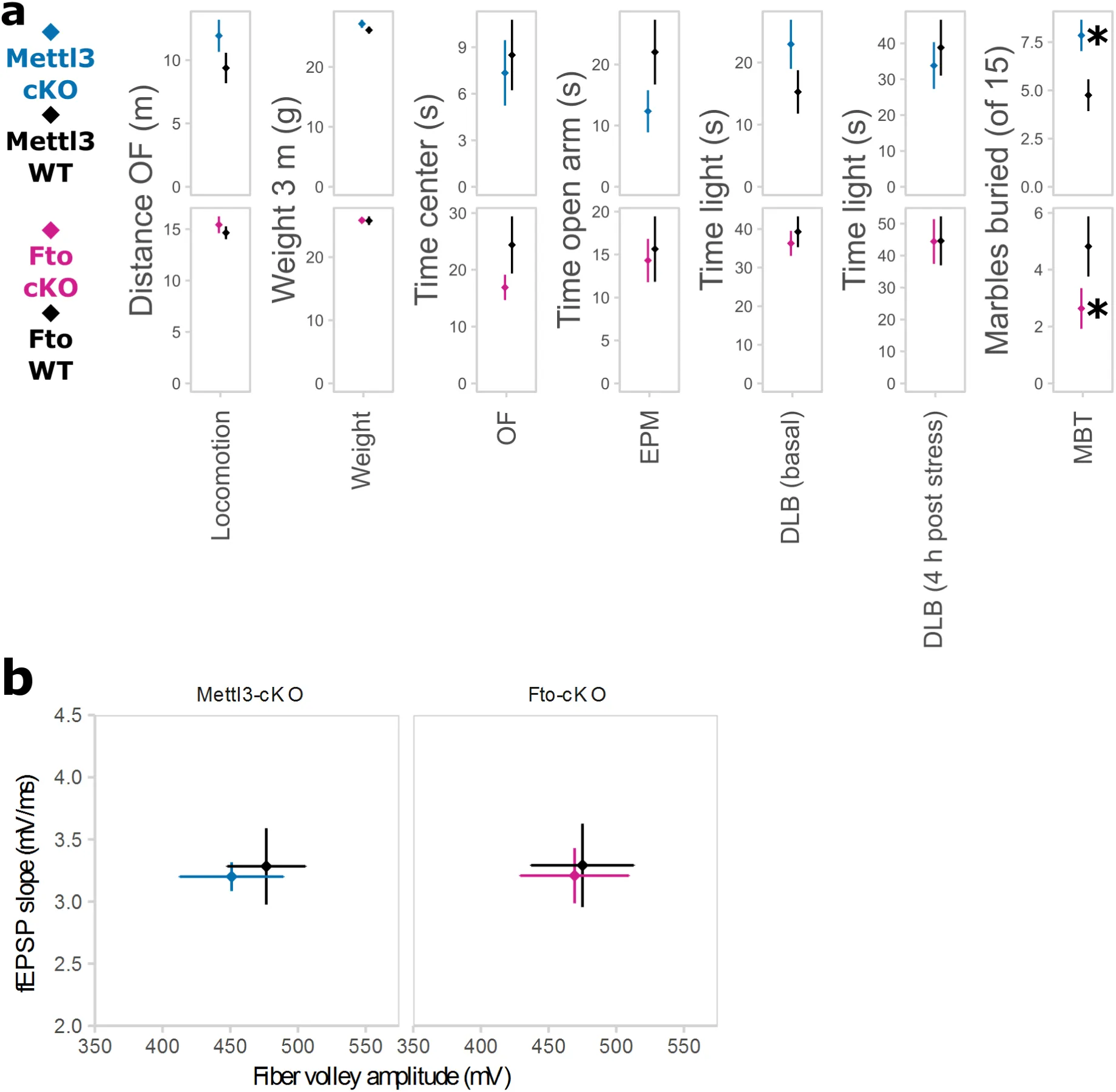 (A) cKO animals did not differ in locomotion, weight or several measurements of anxiety-like behaviour, but spontaneous digging behaviour. OF = Open Field Test, EPM = Elevated Plus Maze, DLB = Dark Light Box, MBT = Marble Burying Test, WT = wild type animals, cKO = conditional knockout animals. Spontaneous burying behaviour as measured by the MBT was increased in Mettl3-cKO animals while decreased in Fto-cKO animals. Weight 6 w post induction with Tamoxifen (average 12 w of age). Marbles buried within 10 min. (n = 11-13, mean ± SEM. * depict T-Tests P<0.05).