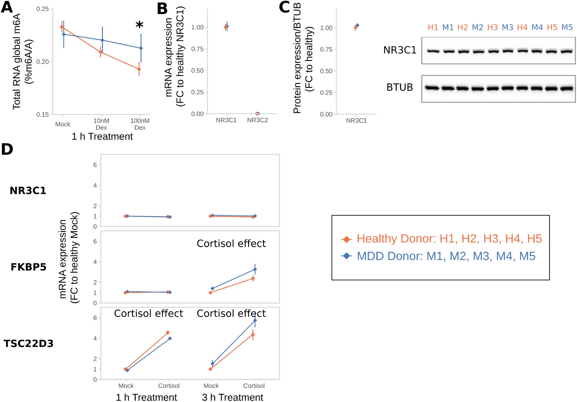 Figure 7:The glucocorticoid induced m6A-reduction in blood is absent in blood and cell lines from donors with Major Depressive Disorder (MDD).