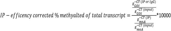 RNA abundance levels were quantified from the input samples using the ddCT method normalizing to the average of all housekeeping genes. Immunoprecipitation efficiency for each biological sample was assessed using the measured abundance of spike-in per m6A-RIP/IgG control sample. Because all conditions per sample were equally split at the beginning, % methylation or IgG signal was calculated as follows:
