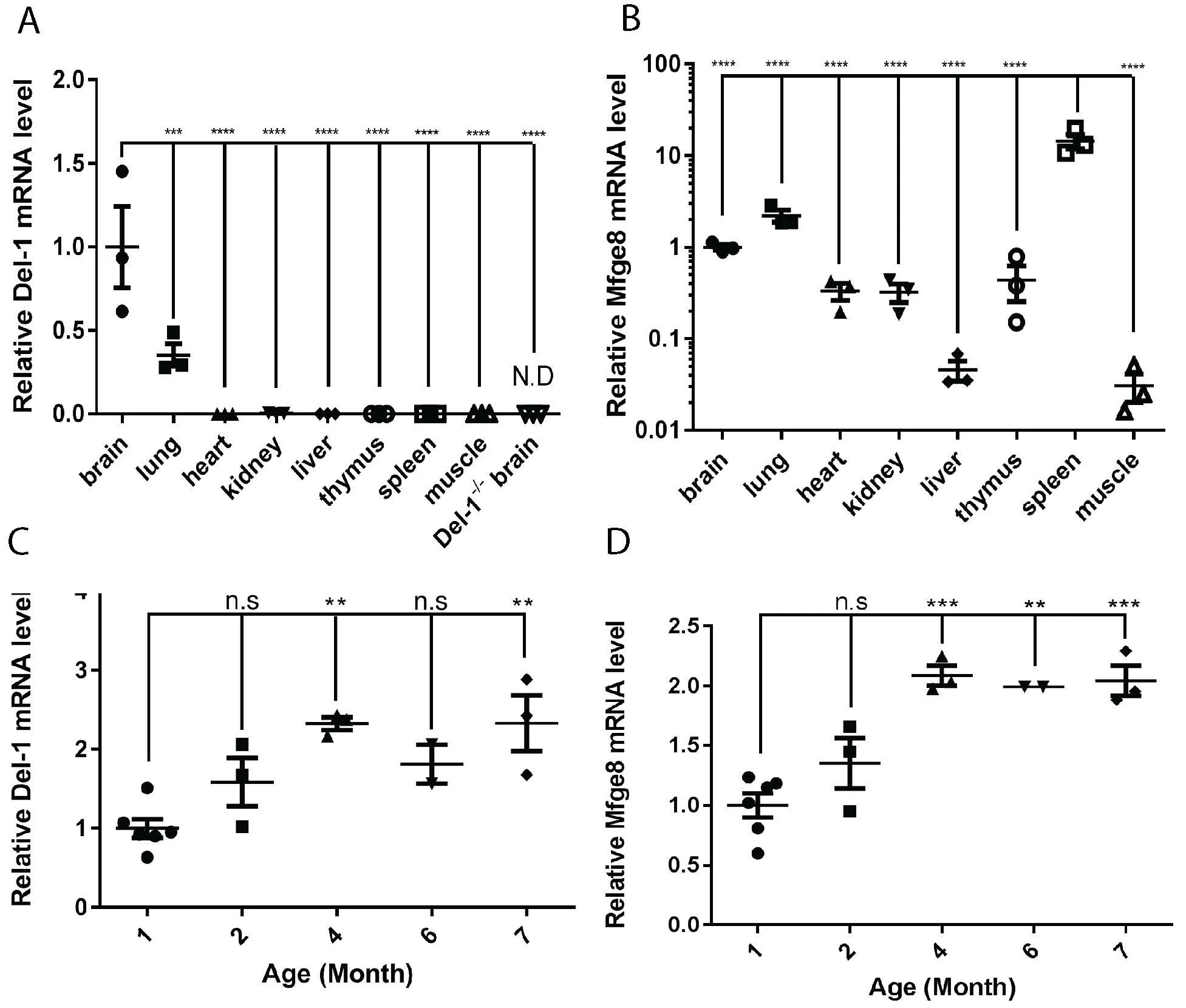 Figure 1:(A-B) qRT-PCR of Del-1 (A) and Mfge8 (B) expression in various mouse organs. Del-1 was significantly expressed in murine brain and lungs, but was barely detectable in other organs. In contrast, Mfge8 was ubiquitously expressed in various organs, with the spleen expresses the highest level. ND: not detectable. ***, p<0.001; ****, p<0.0001. (C-D) qRT-PCR of Del-1 (C) and Mfge8 (D) expression in mouse brains at different ages. Both Del-1 and Mfge8 expression increased from 1-month to 4-months old and stabilized thereafter. **, p<0.01; ***, p<0.001; n.s, not significant.