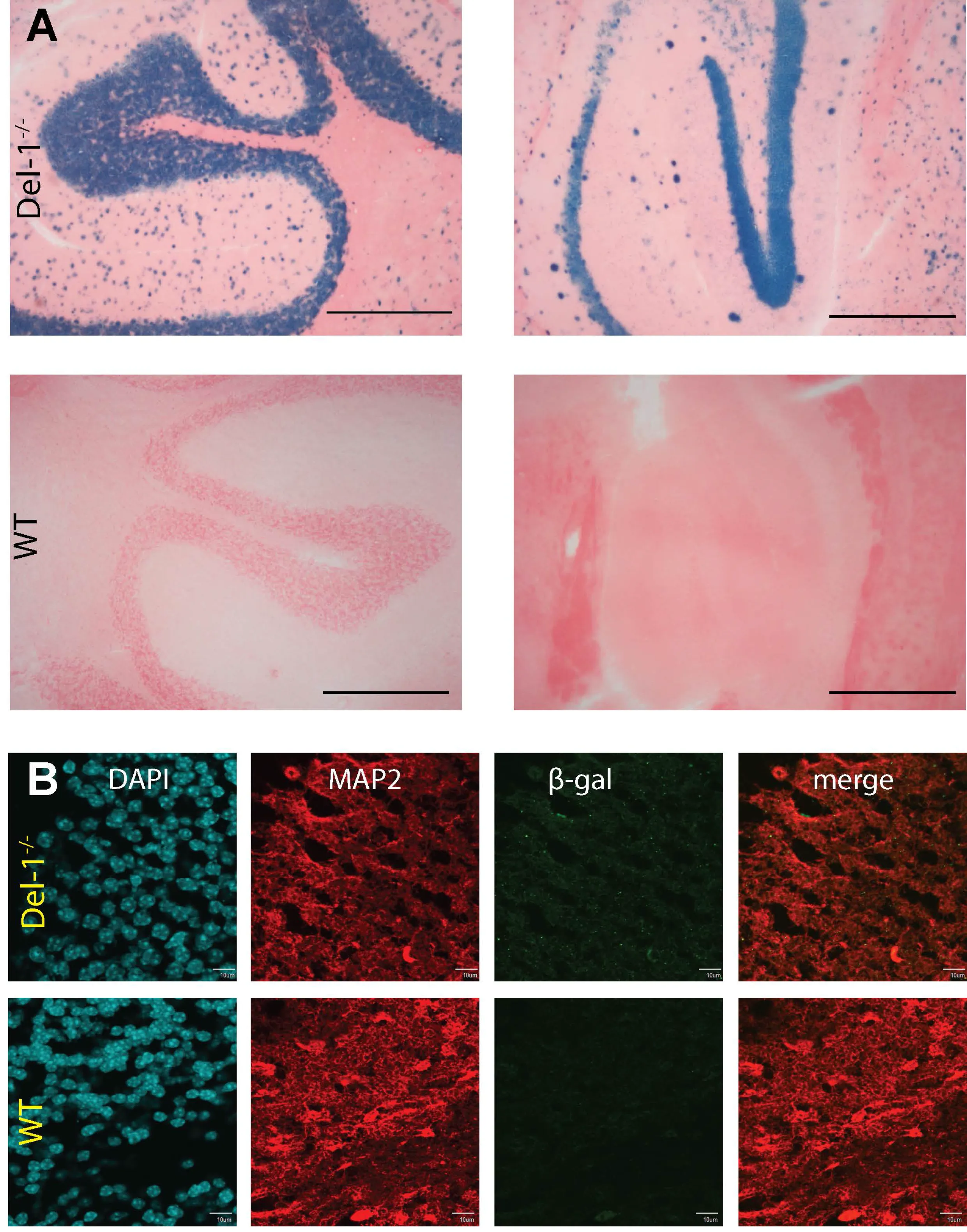 Figure 2:(A) X-gal staining on Del-1−/− and wild type mouse brains. X-gal staining detected intense signals in the granular layer of the cerebellum (left panel) and hippocampus (right panel) in Del-1−/− mouse brains. Whereas in the negative control wild type mouse brains, no X-gal staining was detected. Scale bars: 200um. (B) Immunofluorescent co-staining of β-galactosidase and neuronal markers MAP2 on Del-1−/− and wild type mouse brains. Colocalization of β-galactosidase stain (green dots) and MAP2 was observed in Del-1−/− mouse brains (upper panel). No β-galactosidase stain (green dots) was detected in negative control wild type mouse brains (lower panel) Scale bars: 10um.