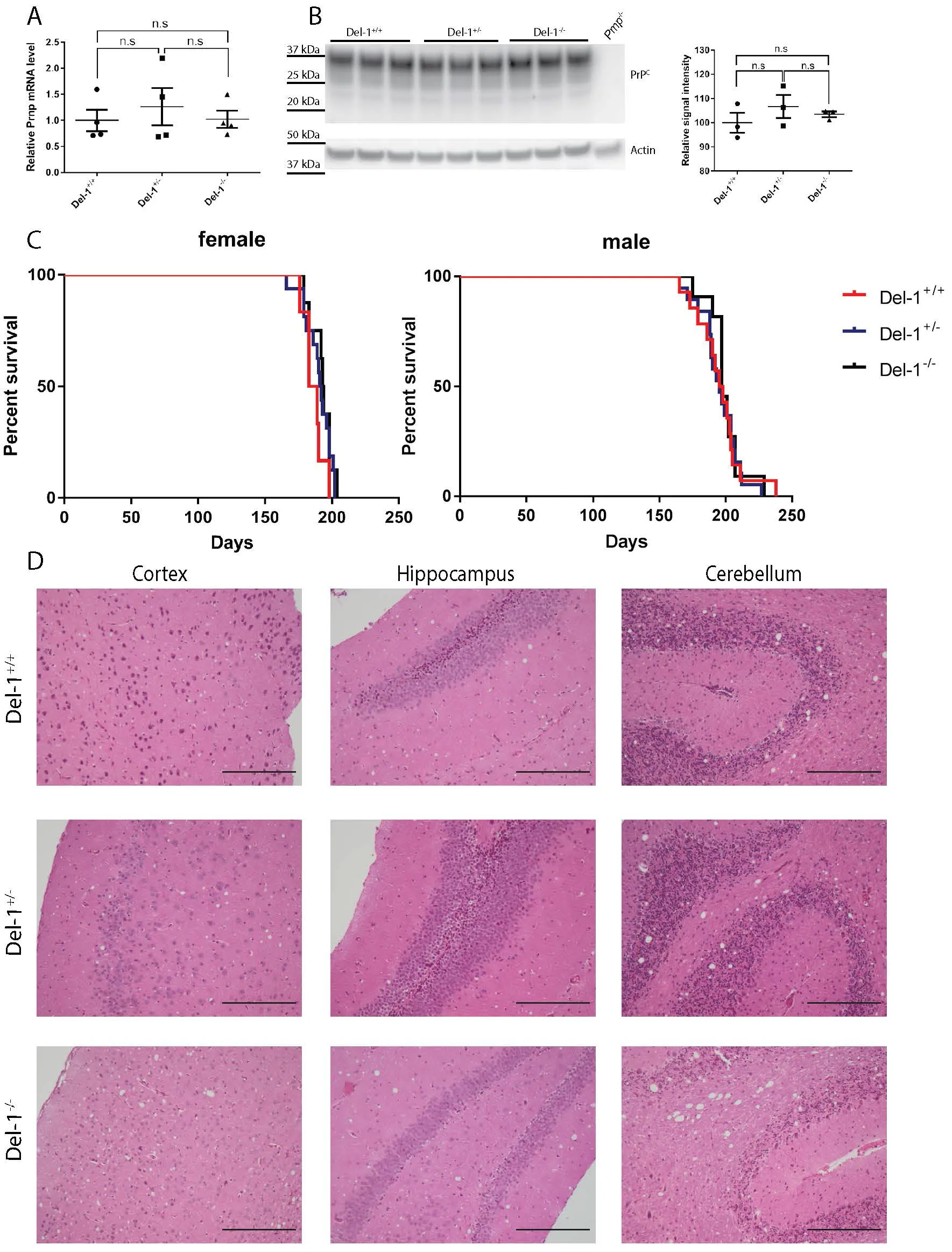 Figure 3:(A-B) Prnp qRT-PCR (A) and PrPC Western blot (B left; densitometric quantification of the Western blot in B right) in Del-1+/+ (WT), Del-1+/− and Del-1−/− mouse brains. No significant difference of Prnp mRNA and PrPC protein was observed between Del-1+/+ (WT), Del-1+/− and Del-1−/− mouse brains. (C) Survival curve of Del-1+/+ (WT), Del-1+/− and Del-1−/− littermates intracerebrally inoculated with RML6. There was no significant difference between three groups in both genders (n=6~19, n.s p>0.05). (D) Representative histology of terminally sick mouse brains from Del-1+/+ (WT), Del-1+/− and Del-1−/− littermates stained for hematoxylin and eosin (H&E). There was no obvious difference between three groups in vacuolation and lesion pattern in cortex, hippocampus and cerebellum, Scale bars: 200um.