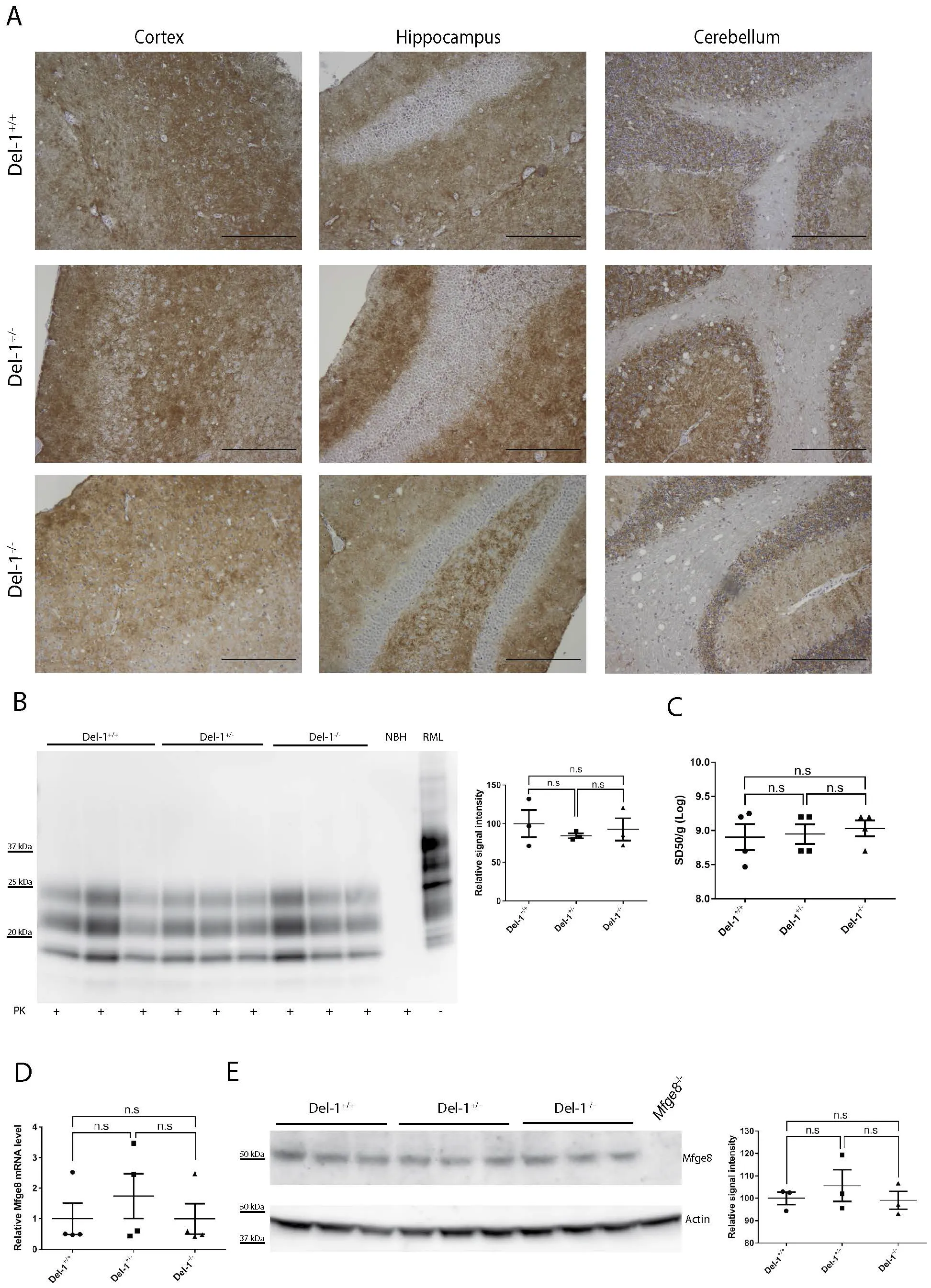 Figure 4:(A) Representative histology of terminally sick mouse brains from Del-1+/+ (WT), Del-1+/− and Del-1−/− littermates stained for SAF84. There was no obvious difference between three groups in PrPSc deposition in cortex, hippocampus and cerebellum, Scale bars: 200um. (B) Left: Western blot for proteinase K resistant PrPSc in terminally sick mouse brains. Right: densitometric quantification of the Western blot showed no significantly difference between Del-1+/+ (WT), Del-1+/− and Del-1−/− littermates (n=3, n.s p>0.05). NBH: non-infectious brain homogenates. (C) RT-QuIC assay of terminally sick mouse brains from Del-1+/+ (WT), Del-1+/− and Del-1−/− littermates showed similar level of 50% prion seeding dose in these three groups (n=4, n.s p>0.05). (D-E) Mfge8 qRT-PCR (D) and Mfge8 Western blot (E left; densitometric quantification of the Western blot in E right) in Del-1+/+ (WT), Del-1+/− and Del-1−/− mouse brains. No significant difference of Mfge8 mRNA and Mfge8 protein was observed between Del-1+/+ (WT), Del-1+/− and Del-1−/− mouse brains.