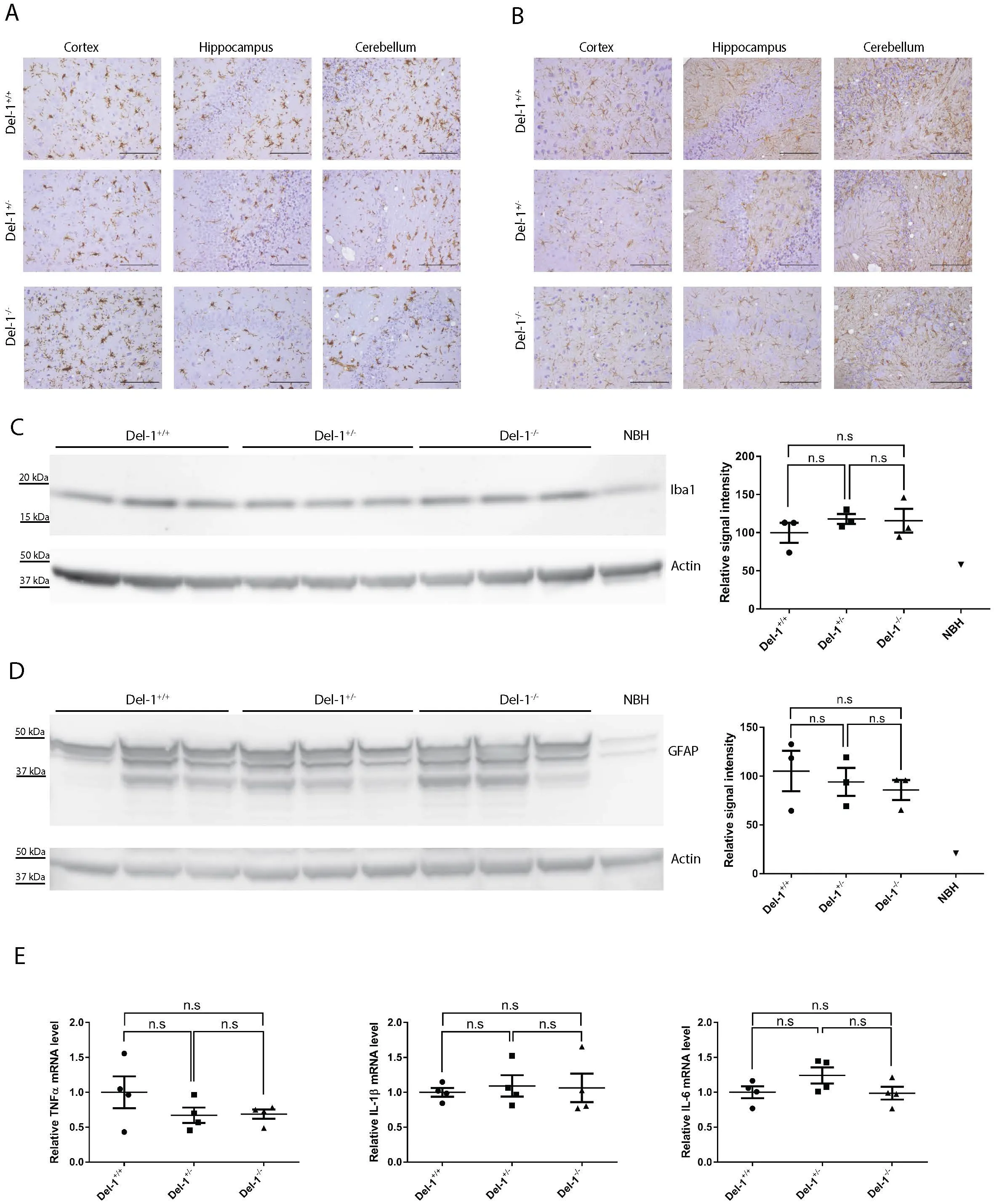 Figure 5:(A-B) Representative immunohistochemical staining for Iba1 (A) and GFAP (B) on cortex, hippocampus and cerebellum of terminally sick mouse brains from Del-1+/+ (WT), Del-1+/− and Del-1−/− littermates, Scale bars: 100um. (C) Left: Western blot for Iba1 in terminally sick mouse brains. Right: densitometric quantification of the Western blot revealed no significant difference of Iba1 levels between Del-1+/+ (WT), Del-1+/− and Del-1−/− littermates (n=3, n.s p>0.05). (D) Left: Western blot for GFAP in terminally sick mouse brains. Right: densitometric quantification of the Western blot showed no significant difference of GFAP levels between Del-1+/+ (WT), Del-1+/− and Del-1−/− littermates (n=3, n.s p>0.05). (E) qRT-PCR of cytokines TNFα, IL-6 and IL-1β expression revealed similar expression levels of these cytokines in terminally sick Del-1+/+ (WT), Del-1+/− and Del-1−/− littermates (n=4, n.s p>0.05).