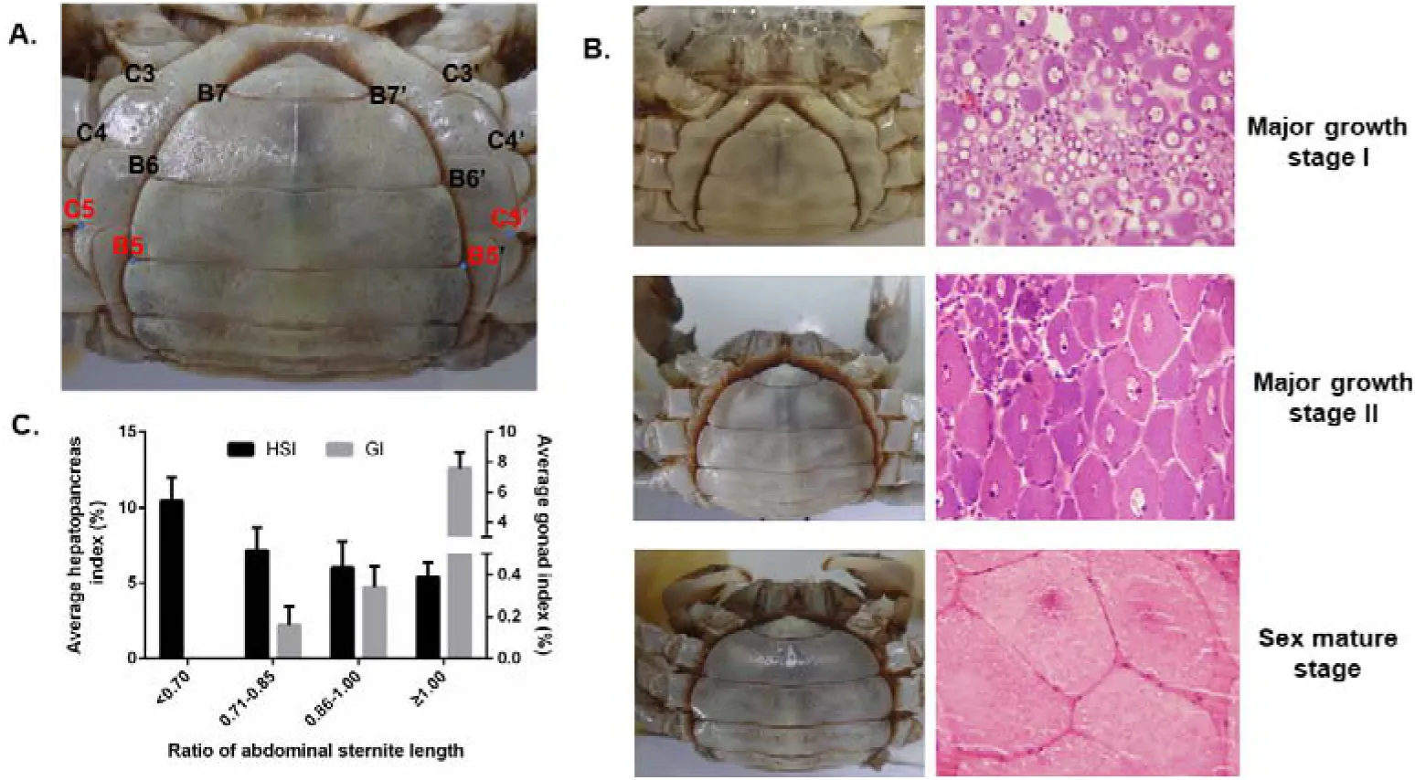 Figure 1:Phenotype characters, histology observation, and hepatopancreas and gonad indexes among different ovary developmental stages of precocious E.sinensis. A. Shape of abdominal sternite of female E.sinensis. B5-B5’ indicated the outside length of the fifth abdominal sternite, C5-C5’ indicated the inside length of the fifth abdominal sternite. B. Different shapes of abdominal sternite corresponding to different ovary developmental stages in female E.sinensis. C. Average hepatopancreas and gonad index among different groups of precocious E.sinensis. HIS: hepapancreas index, GI: gonad index.