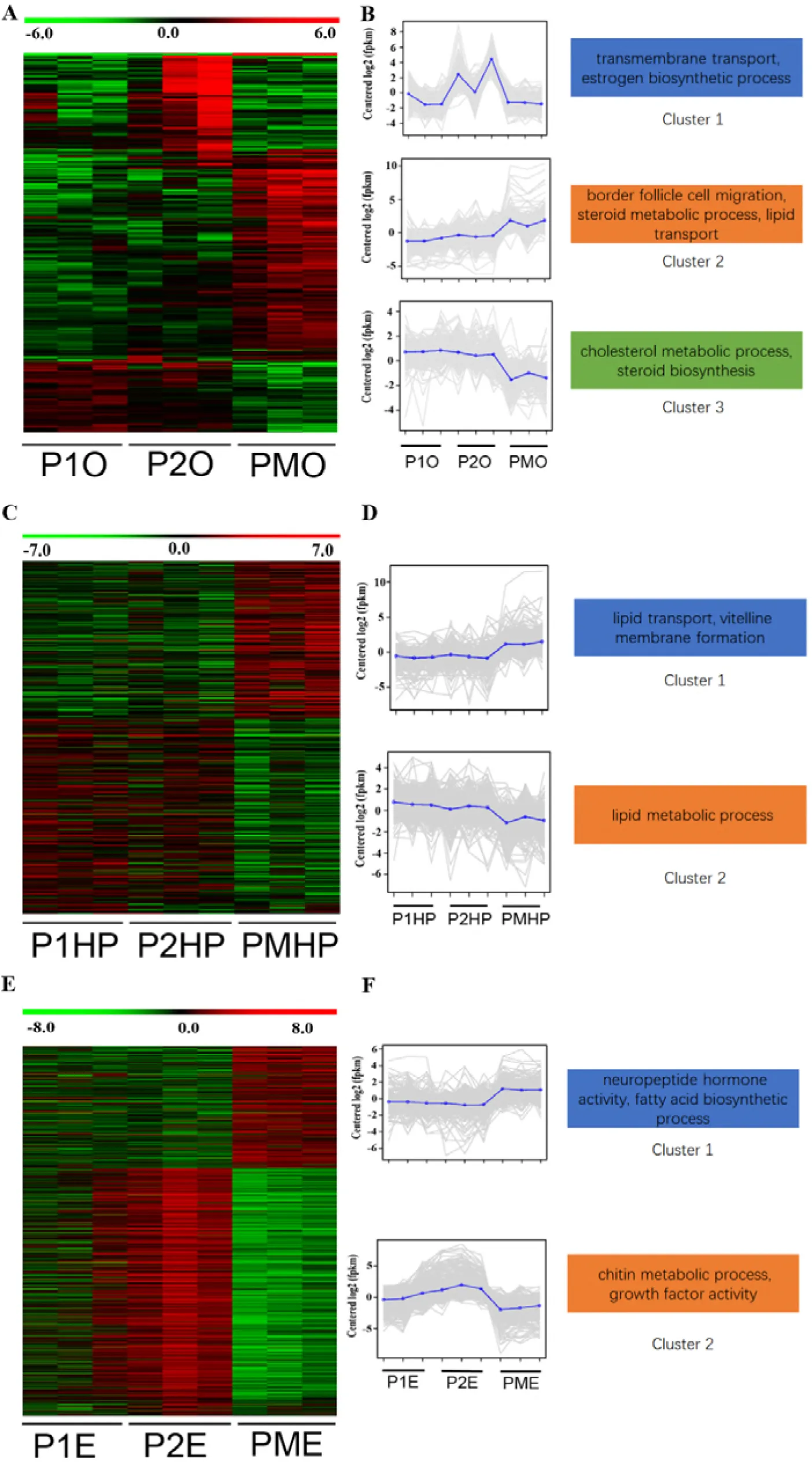 Figure 2:Expression patterns of differentially expressed genes in precocious ovary, hepatopancreas and eyestalk tissues. A. Heatmap of differentially expressed genes in ovary. B. Gene expression plot for the three defined clusters. C. heatmap of differentially expressed genes in hepatopancreas. D. Gene expression plot for the two defined clusters. E. heatmap of differentially expressed genes in eyestalk. F. Gene expression plot for the two defined clusters. P1O, P1HP, P1E indicated precocious ovary, hepatopancreas, and eyestalk with ovary in major growth stage I; P2O, P2HP, P2E indicated precocious ovary, hepatopancreas, and eyestalk with ovary in major growth stage II; PMO, PMHP, PME indicated precocious ovary, hepatopancreas, and eyestalk with ovary in sex mature stage.