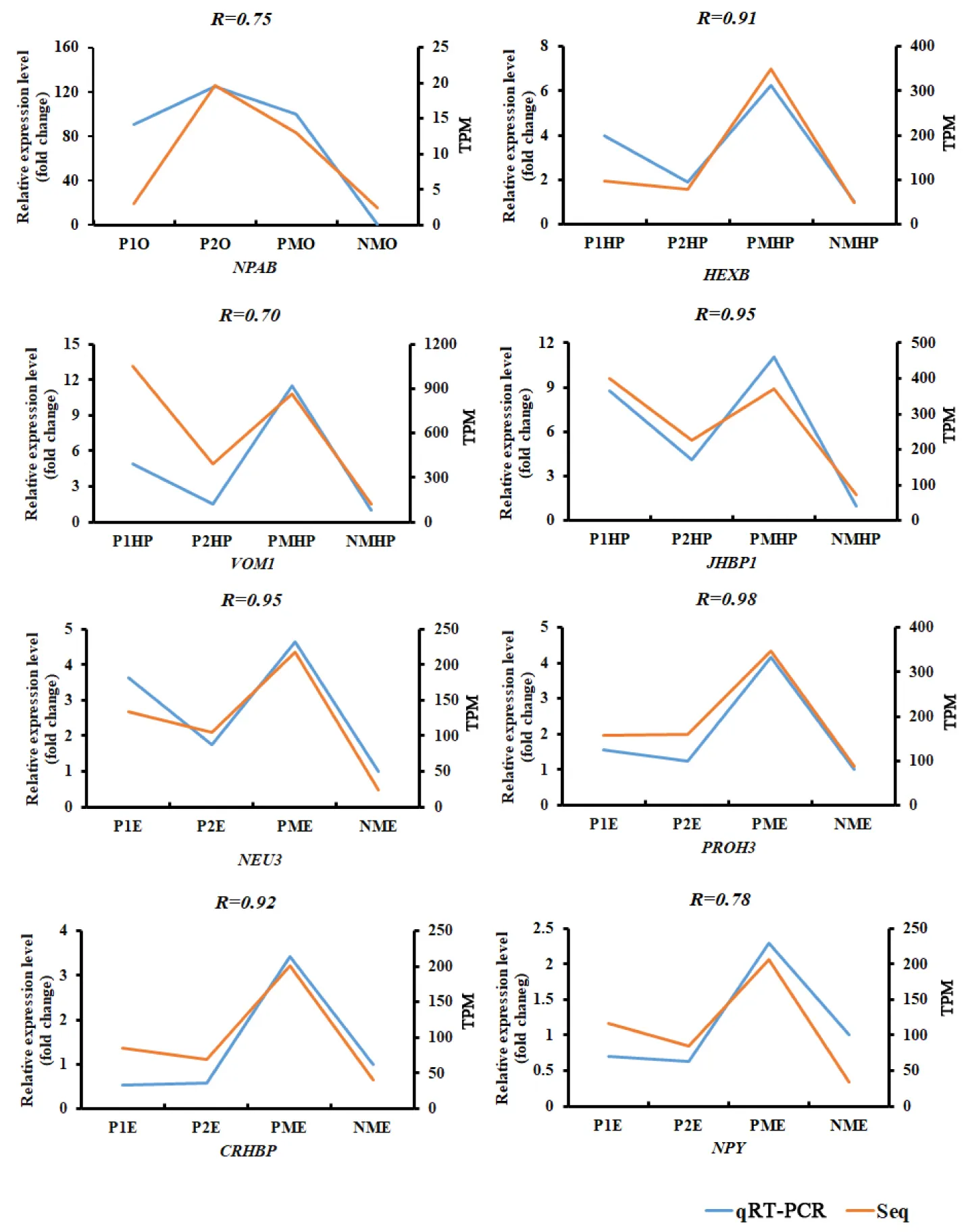 Figure 3:Expression profiles of eight differential expressed genes from RNA-Seq (orange) and qRT-PCR (blue) at different developmental stages of the ovary. P1O, P1HP, P1E indicated precocious ovary, hepatopancreas, and eyestalk with ovary in major growth stage I; P2O, P2HP, P2E indicated precocious ovary, hepatopancreas, and eyestalk with ovary in major growth stage II; PMO, PMHP, PME indicated precocious ovary, hepatopancreas, and eyestalk with ovary in sex mature stage.