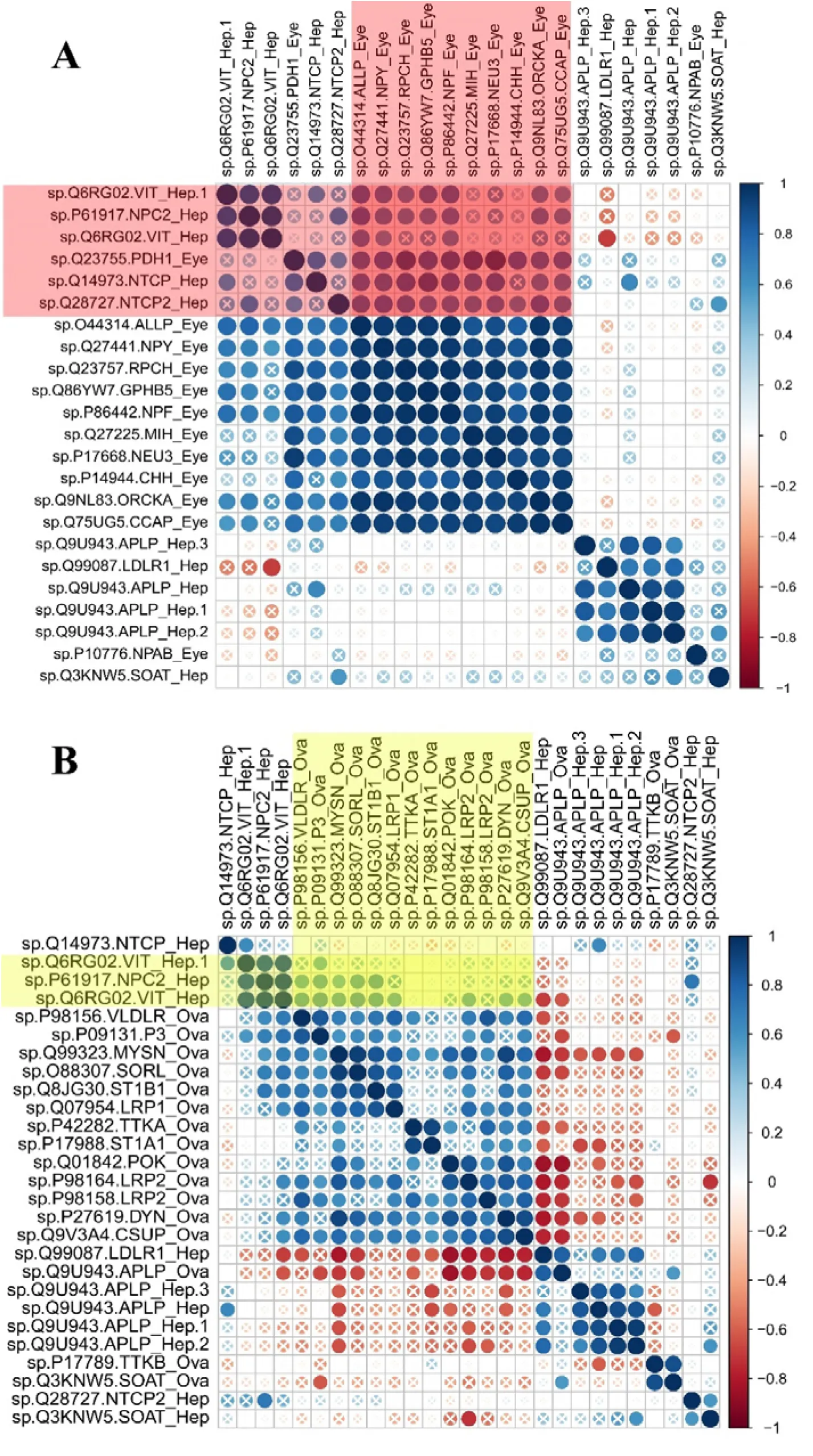 The correlation coefficient adjacency matrix indicated that DEGs in eyestalk annotated as neuropeptide hormone activity such as NPY, RPCH (SP|Q23757), GHBP5, NPF, ORCKA (SP|Q9NL83_ORCKA), CCAP, Helicostatins (SP|Q44314_ALLP) were positively correlated with DEGs in hepatopancreas annotated as lipid transport such as VG (SP|Q6RG02), NPC2 (SP|P61917), SLC10A1 (SP|Q14973), SLC10A2 (SP|Q28727) (P<0.05) (Figure 4A, red shade area). Meanwhile, DEGs in hepatopancreas annotated as lipid transport such as VG (SP|Q6RG02), NPC2 were positively correlated with DEGs in ovary annotated as oogenesis, border follicle cell migration, steroid metabolic process, lipid transport (Figure 4B, yellow shade area) (P<0.05). However, most DEGs in eyestalk annotated as neuropeptide hormone activity were not correlated with DEGs in ovary, only SLC10A3 (SP|P09131) showed positively correlation with Helicostatins, RPCH, GHBP5, and CCAP genes (Figure S1).
