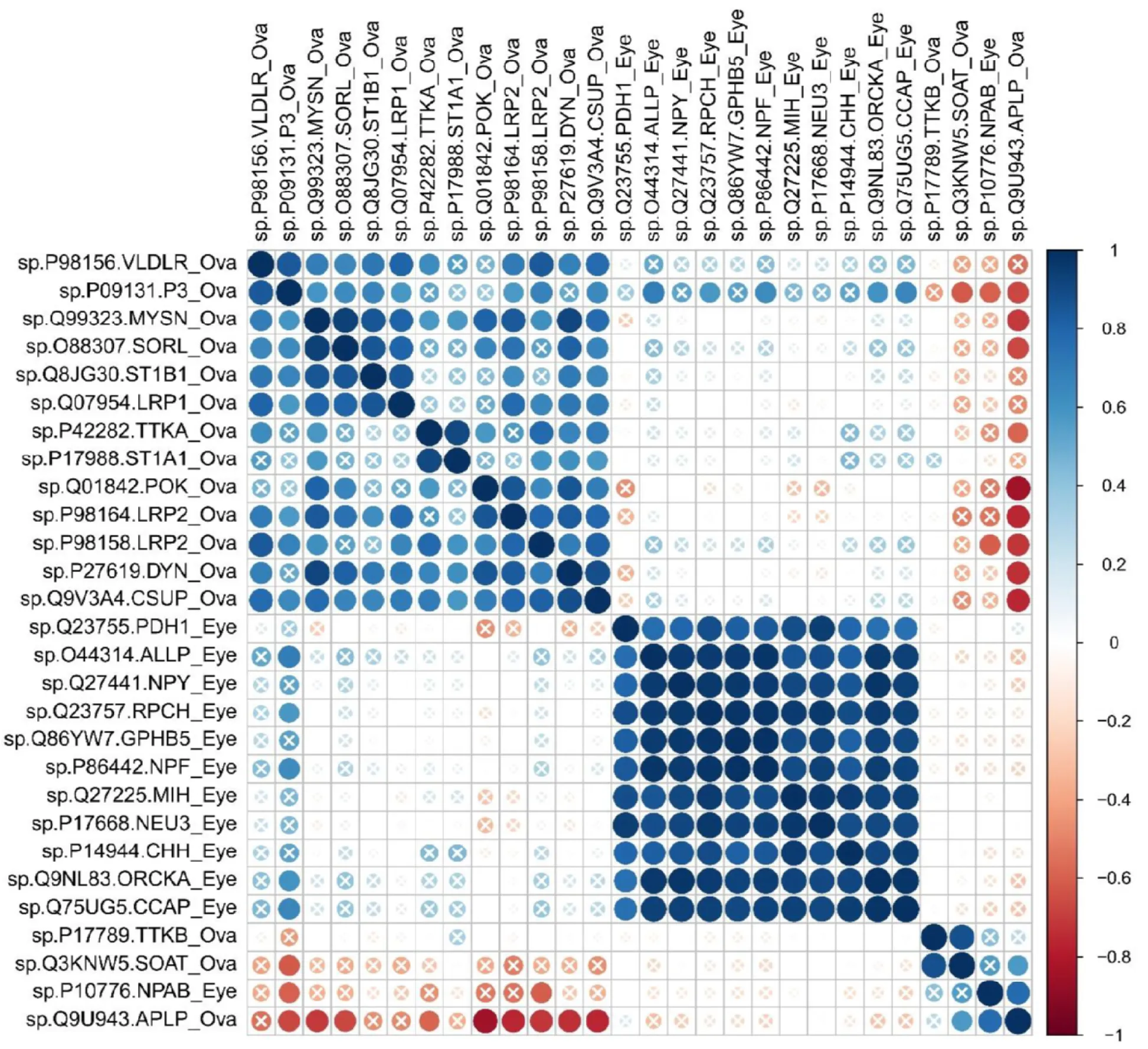 Figure 5:Pearson correlation of gene expression levels of DEGs between ovary and eyestalk (P<0.05). “X” symbol indicated P value >0.05 for the Pearson correlation.