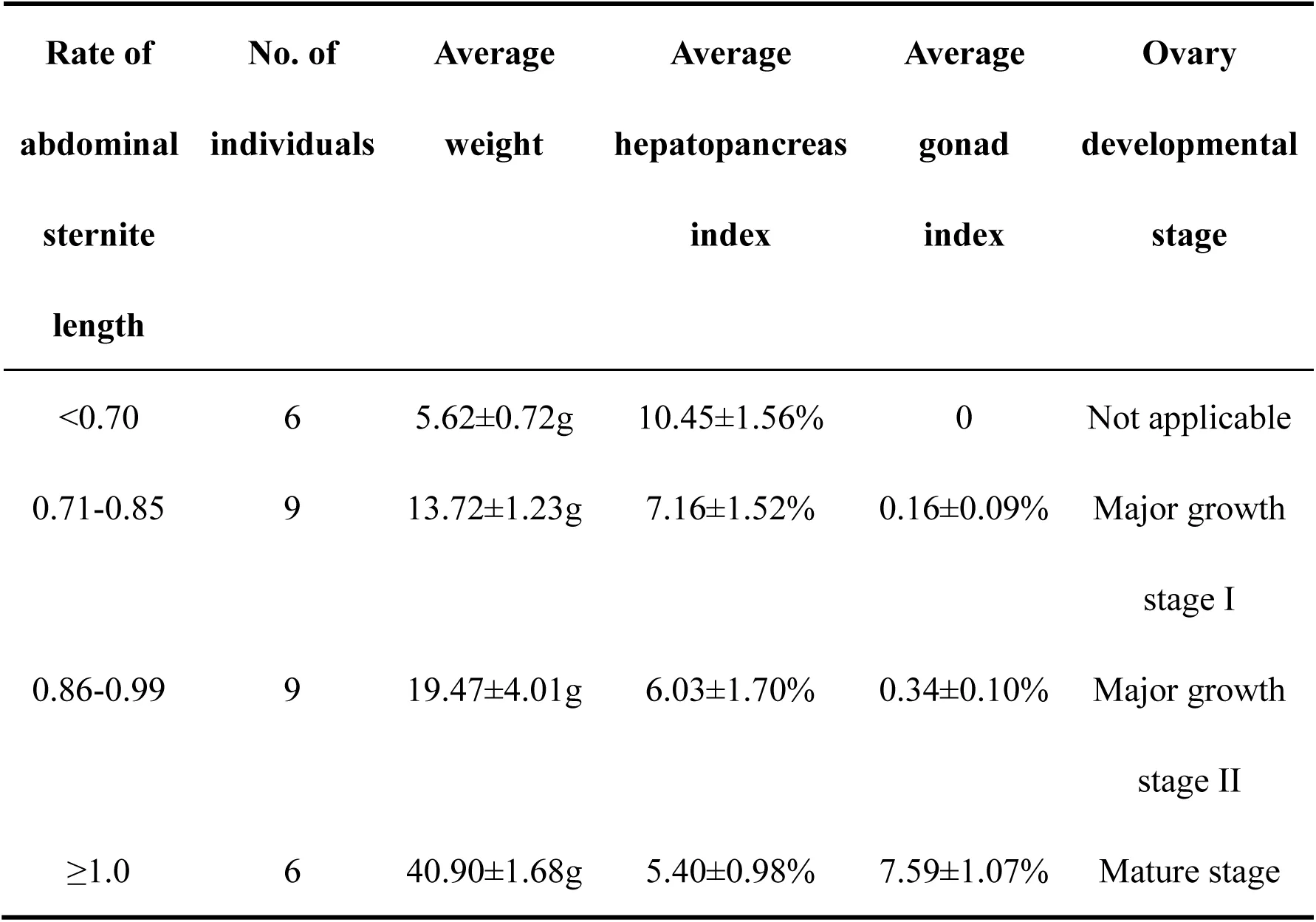 According to the ratio of abdominal sternite length and the histological observation from collected potential precocious E. sinensis individuals, four groups of E. sinensis with different ovary developmental stage were clearly identified. Group I, the ratio was less than 0.7 and no clearly ovary tissue was discovered; Group II, the ratio was ranged from 0.71-0.85, the ovary developmental stage was in major growth stage I; Group III, the ratio was 0.86-1.0 and the ovary developmental stage was in major growth stage II; Group IV, the ratio was greater than 1.0 and the ovary stage was completely mature with clearly oocytes (Table 1, Figure 1B). The hepatopancreas index decreased from 10.45% to 5.40% and the gonad index increased from 0 to 7.59% accompanied with the abdominal sternite length ratio increased from 0.70 to 1.00. (Table 1, Figure 1).
