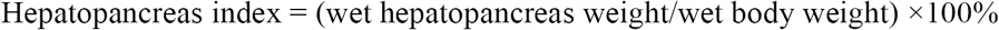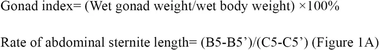 For the collected E. sinensis individuals, phenotype characters such as body weight, ovary weight and hepatopancreas weight were measured, and abdominal sternite length were also recorded according to previous research Li et al., 1998. Hepatopancreas index (HSI), gonad index (GI), and ratio of abdominal sternite length were calculated according to the following formula.